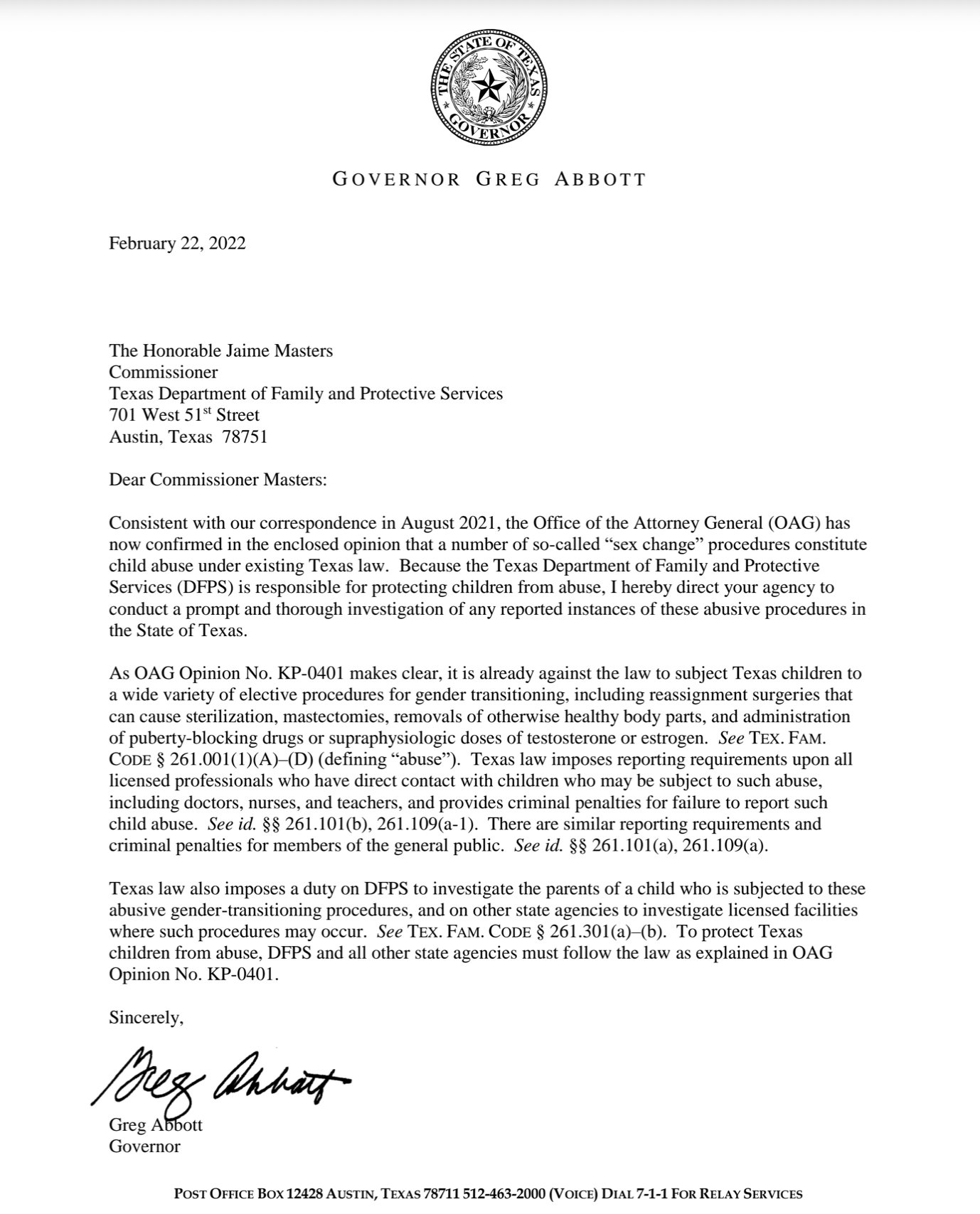 Texas seemingly outlawing sub adolescent gender transitioning procedures and prosecuting parents who are supportive, along with requiring teachers, doctors, etc., to rat out the “offenders”, under penalty of prosecution.