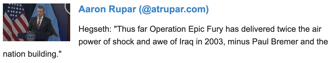 Hegseth is as batshit as Trump if you read through Aaron’s thread this morning, Here’s a guy who relishes death and destruction - he sounds like a psychopath triumphalist. No measured words and tones here. Disturbing to have such a man second in charge of so much military power.