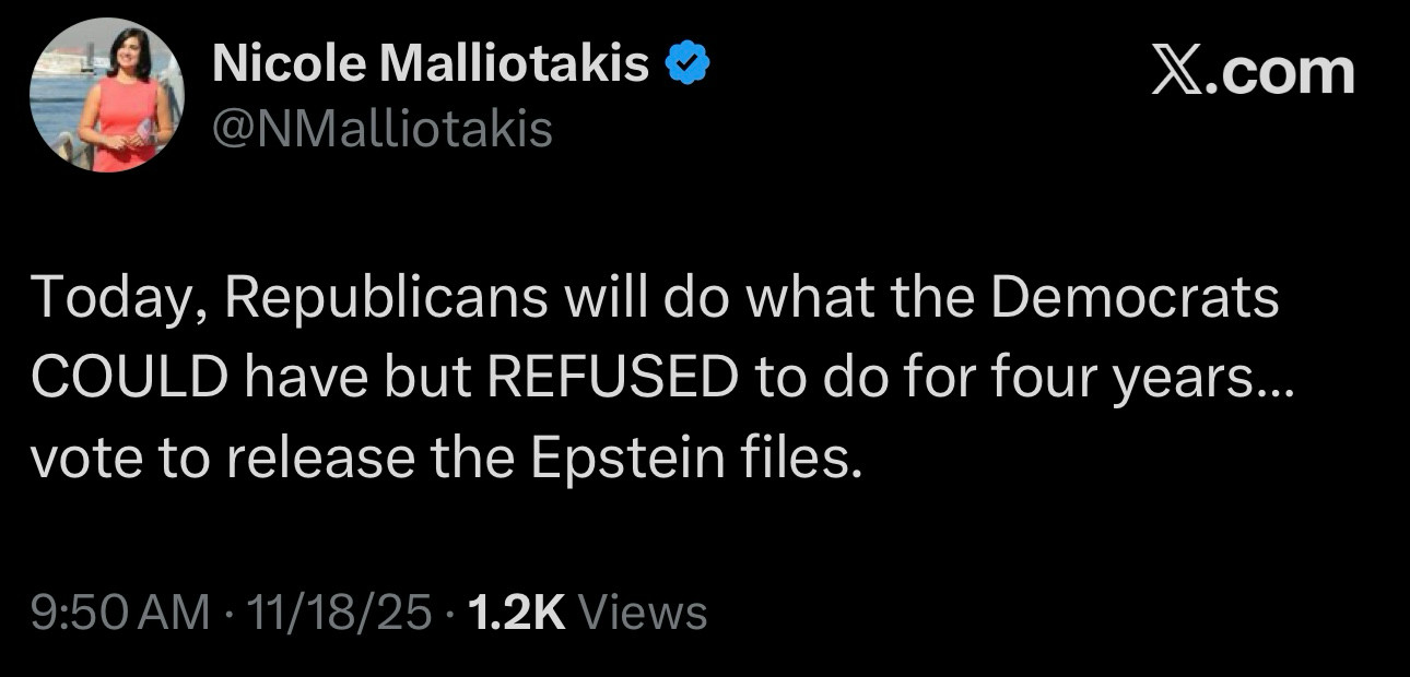 Say the bill passes and Trump signs it and then says “We’ve already released everything we can legally release.” This just takes us back to last January when Bondi “released” the files she had “sitting on her desk.” Is there any reason why the same GOOPers and MAGA and Q-Anon folk aren’t going to be pissed off again, if not even more pissed off because they’re trying the same dumb trick that flopped so badly back then?