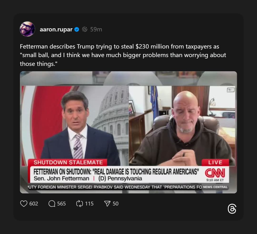 Just another clear indication that Fetterman has jumped the shark…. I mean, the aisle and is no longer a Democrat in the Senate. The next question that should’ve been asked is how that $230 million dollars could have been spent helping the American people rather than the ego of the man that would be king.