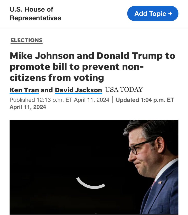 Rather than passing aid for Ukraine and strengthening our border, MAGA Republican Trumper Mike Johnson and his cult leader offer a bill to stop illegal aliens from voting.