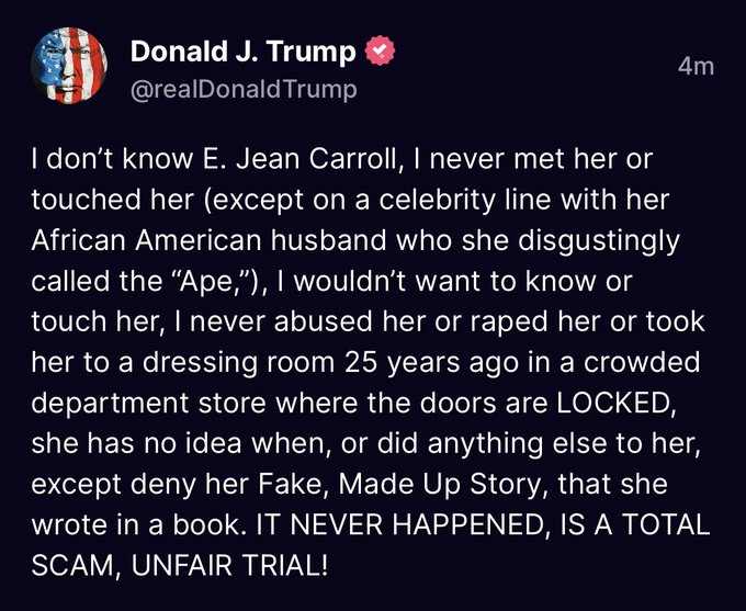 E. Jean Carroll’s next court win over Sexual Predator should include an automatic $10 Million for each future defamation, just to save the court’s time. Another possibility is the court rachets up the award by a few magnitudes in response to his continuing egregious behavior. It’s only fair to make the penalty as much as tfg needs to get his alleged attention.