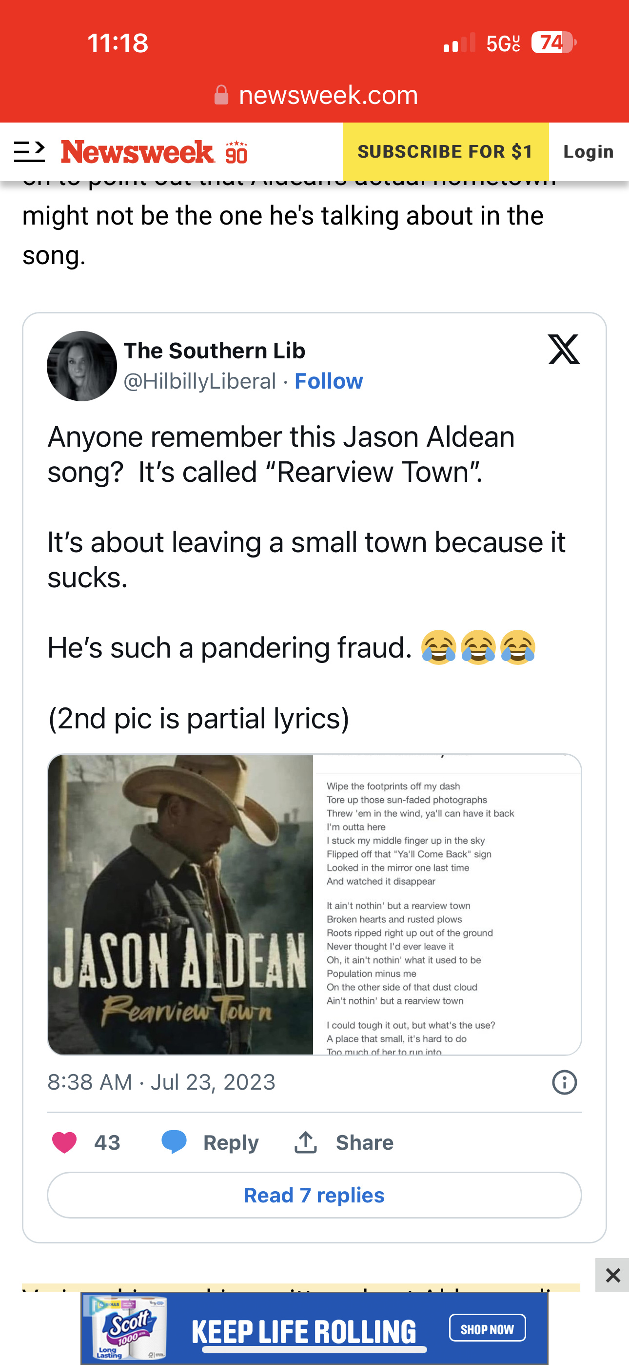 If Aldean was a talented songwriter or didn’t use the writers from the Nashville hit factory and was actually an artist like a Jason Isbell, Willie Nelson, Johnny Cash or Kris Kristofferson his Try that in a small town song would have painted a picture and told a story and about what occurred at that courthouse in 1927. Instead he wrote some screed about what goes through someone’s Fox News brain addled mind.