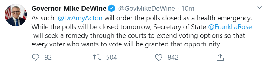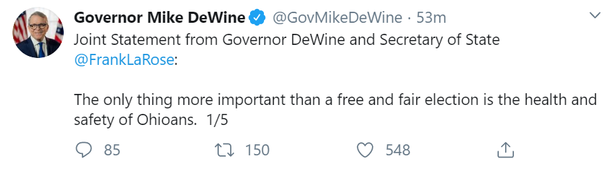 Actually the situation is a democracy/health mess. They are having trouble getting volunteers to work the polls, polling places that people are used to going to have been changed because of locations in schools, nursing homes, etc. I’m not sure that the health director’s authority came up in the decision. In addition, they are thinking of going to vote by mail which could really be a test run to improve the toxic voting environment in the buckeye state. So there are unintended consequences blooming all over the place.