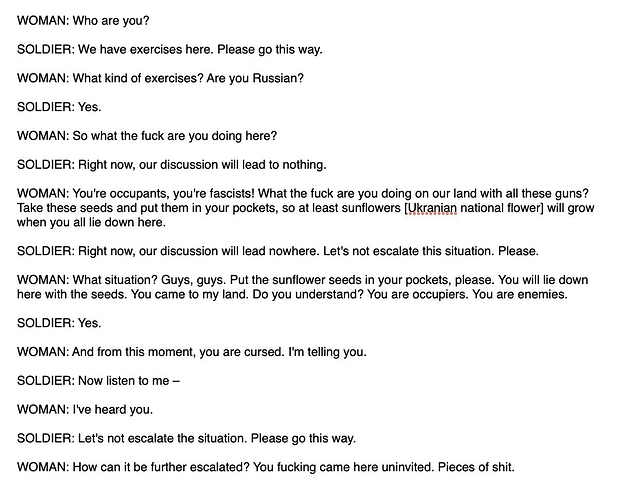 Was going thru some files of mine and I found this conversation between a Ukrainian Babushka (grandmother) and a Russian soldier. This interaction took place at the beginning of Russia’s invasion of Ukraine. I think it’s very revealing… The soldier is carrying an automatic assault rifle, the lady is unarmed except for an outsized mountain of courage. It takes real guts to seriously insult an armed soldier like she did and survive.