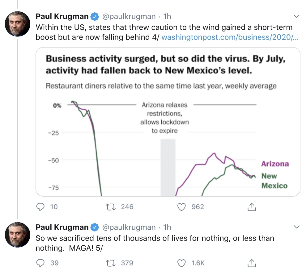 C’mon guys, give Koke-low a break. Every sector of the economy won’t recover simultaneously but share in casket makers, crematorium chains, funeral home chains, cemetery chains, shady vaccine makers and the like are taking off. Plus, when there is an equilibrium, I’ll call it the Stable Trump Equilibrium (STE), between the number of job-seekers and covid dead, the unemployment rate will fall.