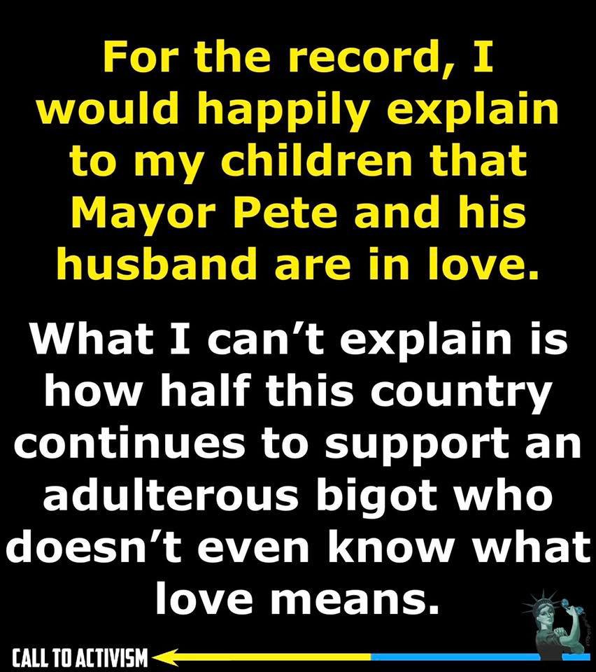 Rush, I don’t care who you slobber on as your significant other. Nor do I particularly care that your “man” bff trump is on his third wife. So neither of you two rate to criticize Pete Buttigieg. Nor do I rate to criticize him. If he is happily married that is fine.