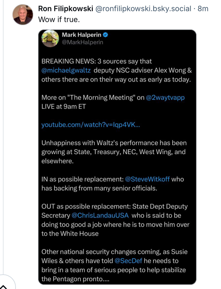 “ Other national security changes coming, as Susie Wiles & others have told @SecDef he needs to bring in a team of serious people to help stabilize the Pentagon pronto…”