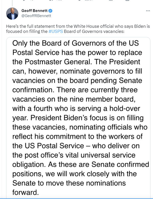 “President Biden’s focus is on filling these vacancies, nominating officials who reflect his commitment to the workers of the US Postal Service — who can deliver on the post office’s vital universal service obligation,” the White House added.