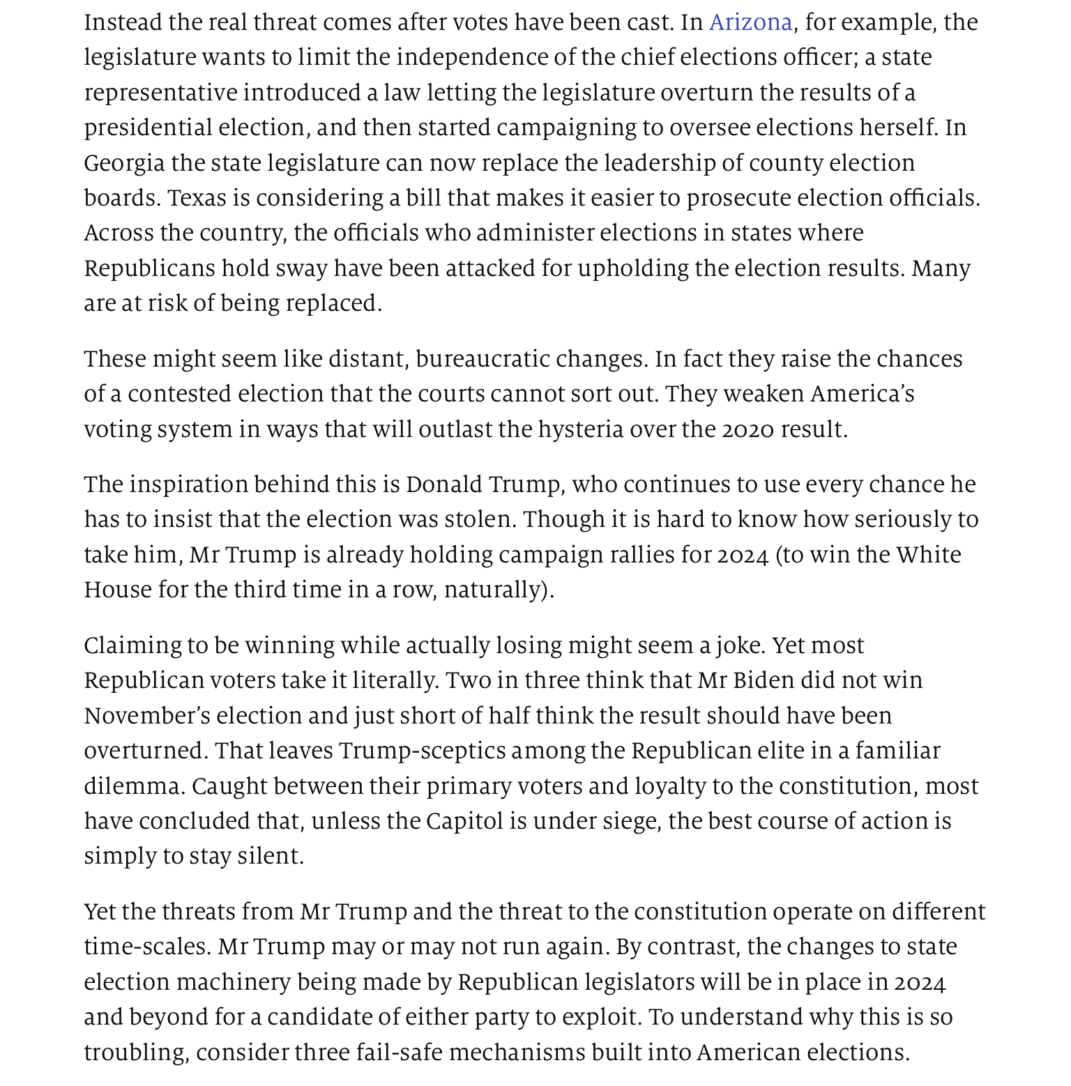 “Arizona’s top elections official has called for a criminal investigation into what she described as former President Donald Trump’s “intense efforts to interfere” with the counting of ballots in last year’s presidential election. In a letter posted to Twitter, Arizona Secretary of State Katie Hobbs urged the state attorney general to probe reports that Trump and his allies—Rudy Giuliani, Sidney Powell, and Kelli Ward—attempted to meddle with ballot counting. Hobbs cited reporting by the Arizona Republic that revealed Ward, chairwoman of the Arizona Republican Party, told the chairman of the board of supervisors: “We need you to stop the counting.” Hobbs wrote on Twitter: “Local reporting recently uncovered intense efforts to interfere with the tabulation of ballots and canvass of the 2020 election in Maricopa County. In Arizona, interfering with election officials is a felony. Today, I asked @GeneralBrnovich to investigate.” According to the Arizona Republic , Brnovich has not yet commented on the request.”
