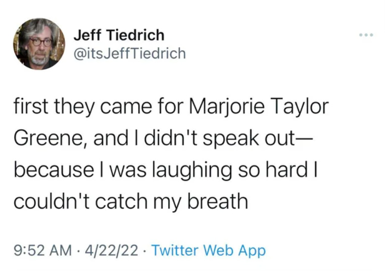 I’d just like her constituents mull over the fact that their Congresswoman who has no committee assignments, lets others tweet for her, maybe, probably, who knows. Add in she’s mad as Hell, but doesn’t remember if she proposed any solutions that would stop making her mad as Hell.