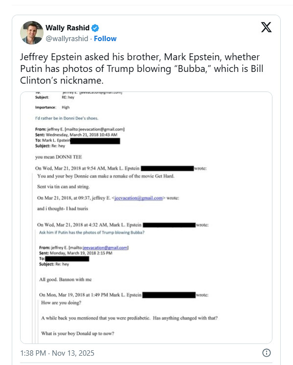 Republicans, “Ok, if libtards are going to selectively leak Epstein emails to smear Trump, we’re going to release more that are SO MUCH WORSE”