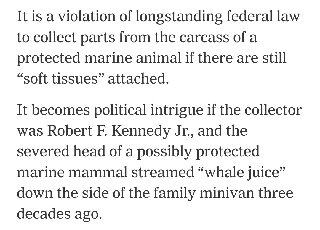 In an update to the bizarre RFK Jr whale decapitation story, the NYT says what could get him in legal trouble is if there remained soft tissue on the carcass at the time he removed the head. Based on the story of whale fluids pouring into the Kennedy car and onto his kid during that 5 hour odyssey, the answer to that question sounds like a most definite YES.