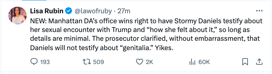 Stormy Daniels may be cautioned to refrain from providing TMI about details of any sexual acts or description of genitalia. Yikes.