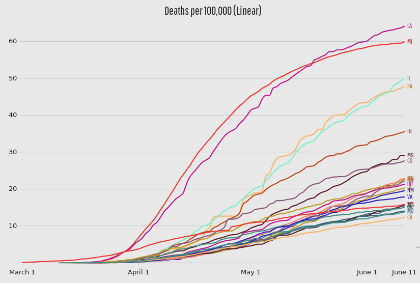 For an illustration, here are curves for the per capita death rates from COVD-19 for a selection of states, I left off some of the really high death rate states in the North East so as not to squash the curves down to much.