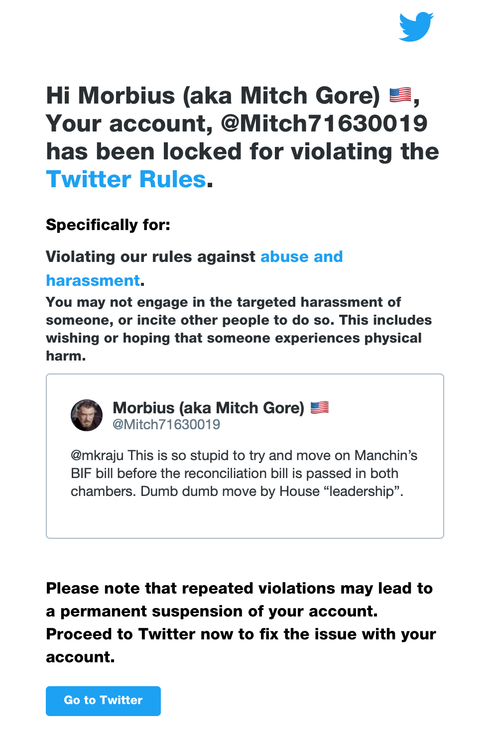 Guess we can’t tweet contrary opinions about the wisdom of voting on Manchin’s BIF bill, or it will make Twitter’s algorithms mad.