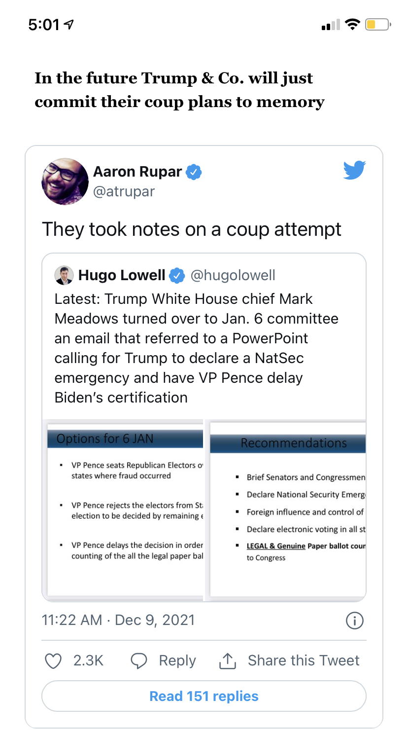 I’m confused. Why would Meadows voluntarily hand over his text messages and e-mails while simultaneously suing the Select Committee, Pelosi, and others and making noises about “executive privilege”? This doesn’t make much sense to me. It’s not as if his texts are devoid of compromising information.