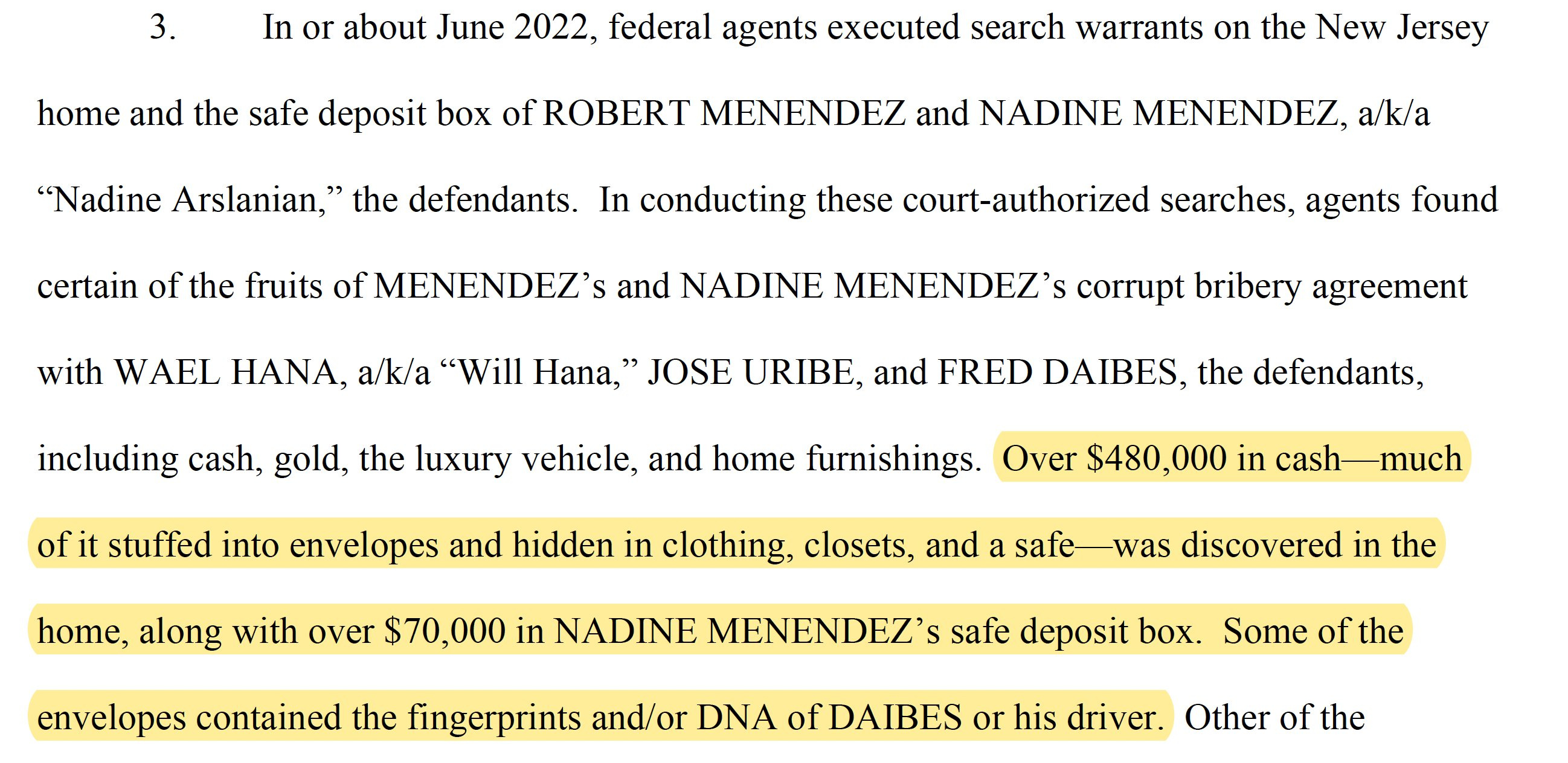 "Over $480,000 in cash—much of it stuffed into envelopes and hidden in clothing, closets, and a safe—was discovered in the home ... Some of the envelopes contained the fingerprints and/or DNA of" co-defendant making alleged bribes. pic.twitter.com/IMmXkzF4cO