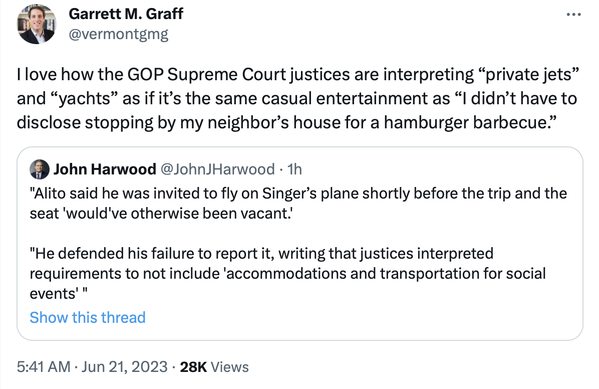 For a sitting member of SCOTUS to go to a friendly media site to write a piece about his corruption and attempting to rebut an article before it’s published tells you all that you need to know about how corrupt and venal he is.