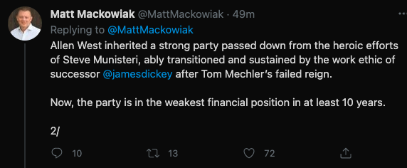 But I seem to recall that they’re all supporting the guy who demanded that the faithful send all their money to him. Now they’re blaming it on Allen West? Hahahahahahahahahaha. Or, did Mr. West do some embezzling here? I guess I expect they are all crooks these days.