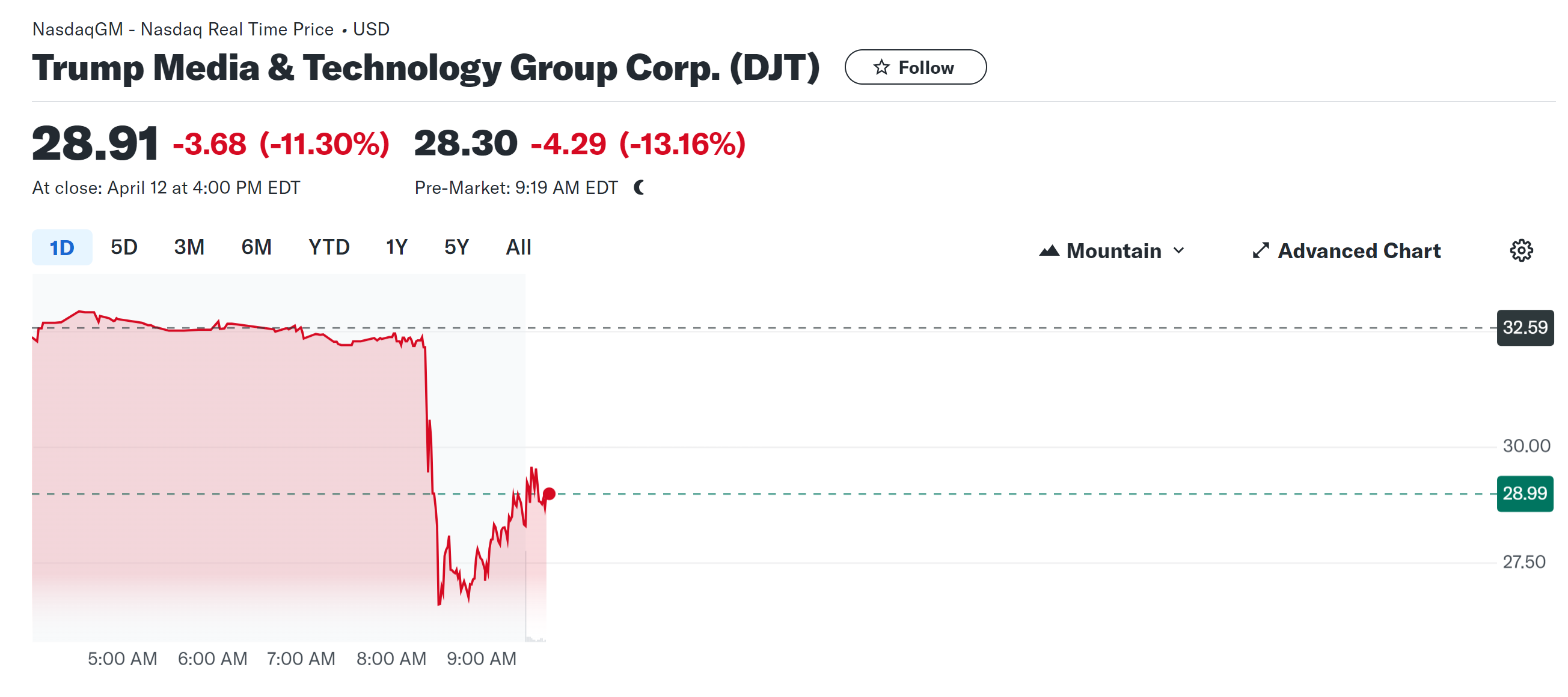 DJT stock in Pre-Market trading down 13% already (for pre-market that’s “yuge” IIRC) and is not really bouncing back now that market is open.