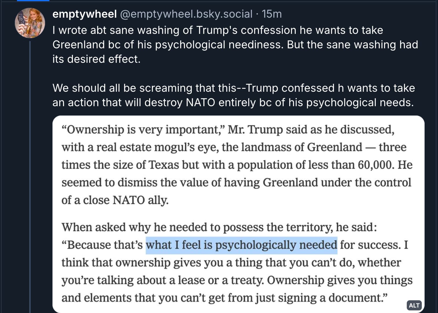 You don’t need ti be an armchair psychologist to see the malignant narcissism. Elect a malignant narcissist, make him unaccountable to the law, give it a good shake, and you better run fast because it’s a more explosive combination than a stick of dynamite.