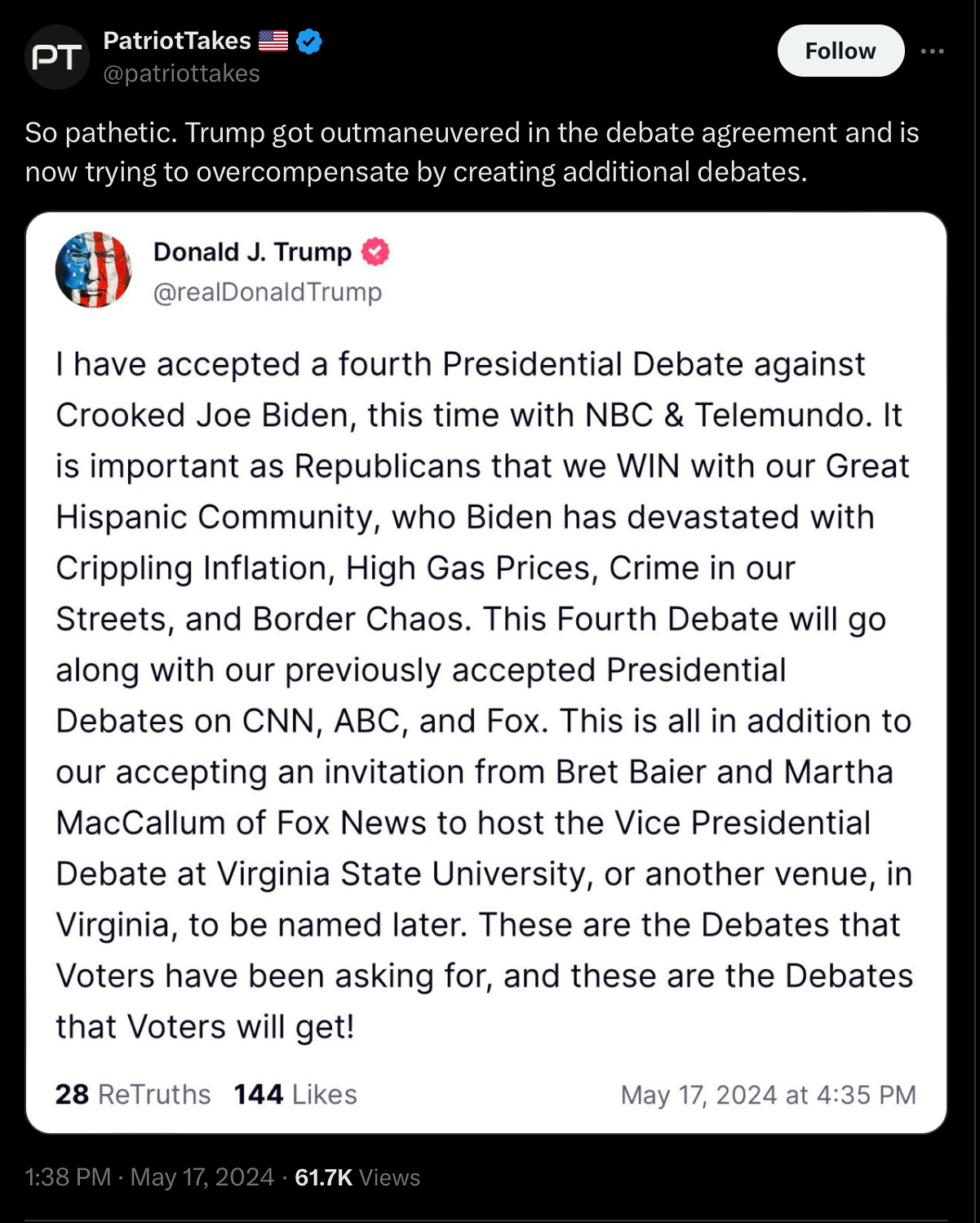 When Biden refuses to accept those new invented debates that Dotard is referring to, TFG will then come back and say “It’s all or nothing!” This way, the Dotard won’t have to participate in any debates at all.