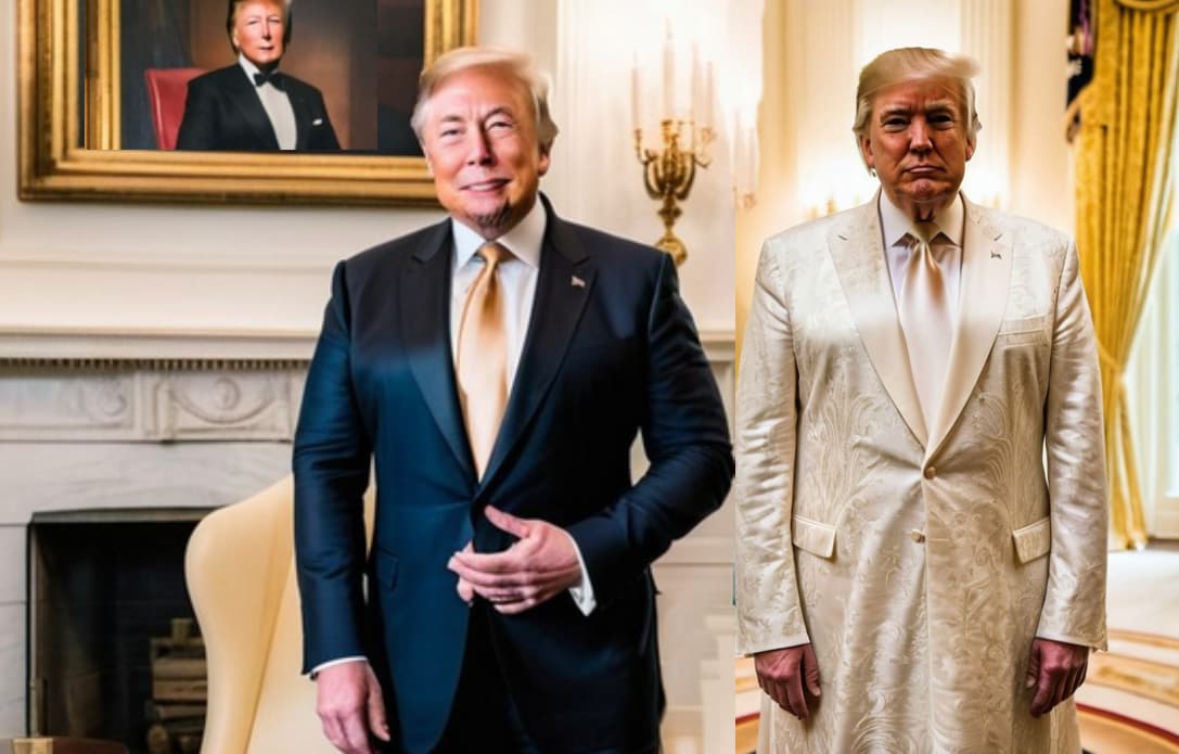 PS: This is me experimenting with AI art-ing. The program I was using wouldn’t generate a single image of ‘Elon Musk as President and Donald Trump as First Lady in the White House’ — so I did them separately and then melded them. A dire threat to everything America is/was supposed to be, doubled, those two are. But how much can Donald’s sociopathic narcissism take being seen as second fiddle to a fellow narcissist sociopath? Hence, may we all share the idea/meme widely in image and text of Trump as a second fiddle to Musk in any way, shape or form. It’s the one mortal sin in his orbit — to divert attention from his absolute hunger and essential and existential need for adulation and to be the Main Character uber alles.