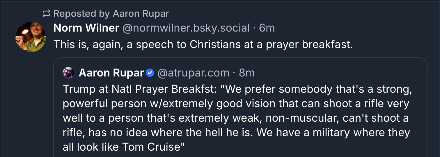 The harpist Leavitt, the nubile virgin, Wiles the cellist, the old crone. And Bondi, in the chair between JD Vance and good old Kash. Too tired for a lesson in the three stages of the female life in the fascist imagination.