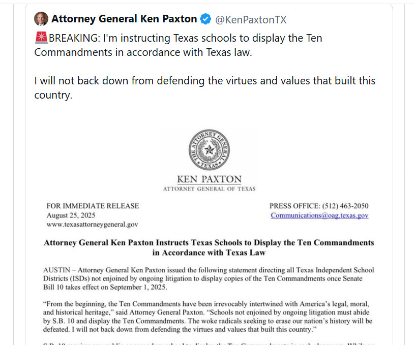 “Might want to brush up on the Ten Commandments, Ken,” Cornyn wrote on X, responding to Paxton’s call for school districts to begin displaying the religious text in classrooms.