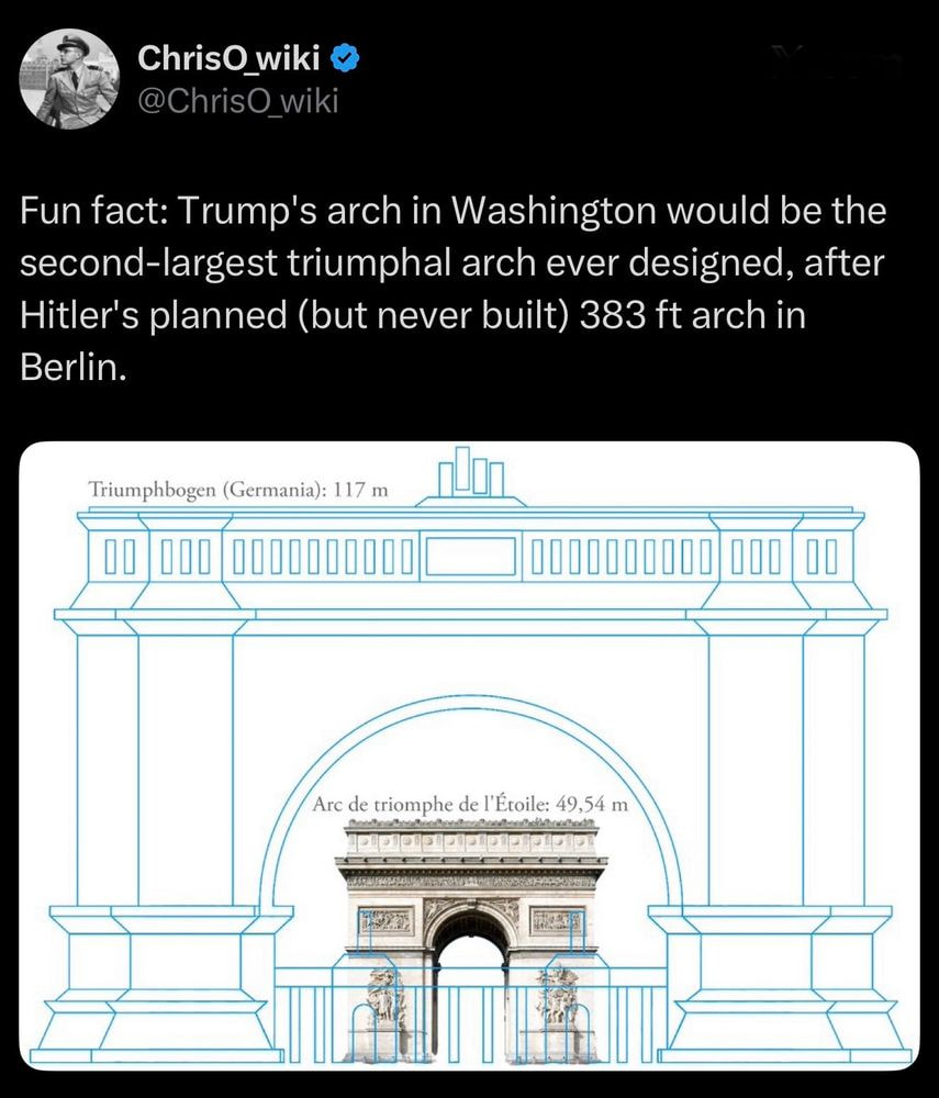 For those who’ve been to the top of the Washington Monument, you know what a wonderful view it is – the Reflecting Pool, the Lincoln Memorial, Memorial Bridge, and then the Custis-Lee Mansion at the top of the hill at Arlington Cemetery. And the sick fuck will RUIN that view with that stupid-ass “arch”.