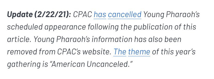 And then, hilariously, theyāve cancelled a couple of their scheduled speakers because they were, quelle surprise racist shit-bags with the tweets to prove it.