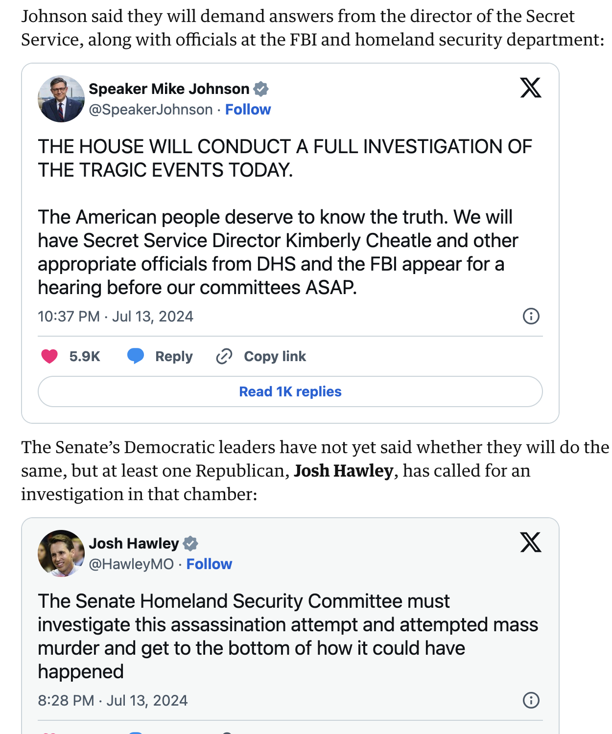 The Secret Service may indeed have some questions to answer – and I am sure they already know that and are feeling the weight of “What did we do miss/do wrong?” more heavily than any of us can readily imagine. But, yeah, Congress might give it like about 5 minutes.