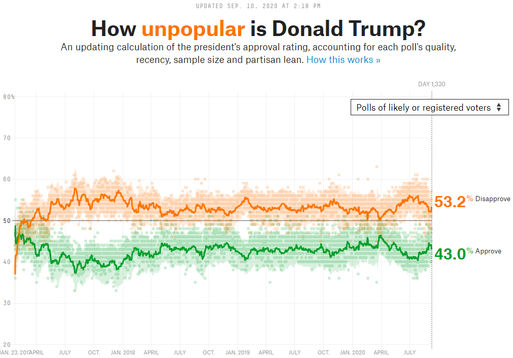 A tightening of these numbers had been occurring since the RNC-- until today. The sum of these exposés are having an effect. Trump’s ‘disapproval’ among ‘likely or registered voters’ has gone up almost 1.5% since Tuesday (in 2 days).