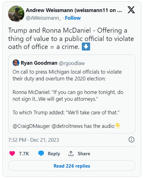 A fair bit of commentary overnight about whether that offer of legal counsel amounted to a criminal attempt at bribery. I’m not prepared to assert that quite yet, but there’s no doubt that having a recording of the phone call, as with the famous Trump call the following month to Georgia election officials, changes the texture and impact of what we previously knew about Trump’s intervention in Michigan, where a prosecution of Trump fake electors is already underway.