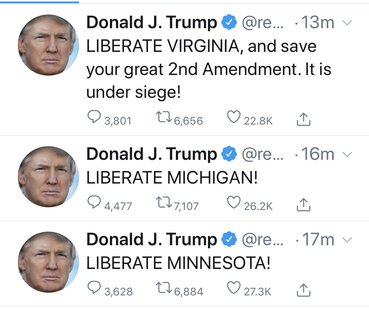 Trump first tweeted “LIBERATE MINNESOTA,” followed by “LIBERATE MICHIGAN,” then “LIBERATE VIRGINIA.”