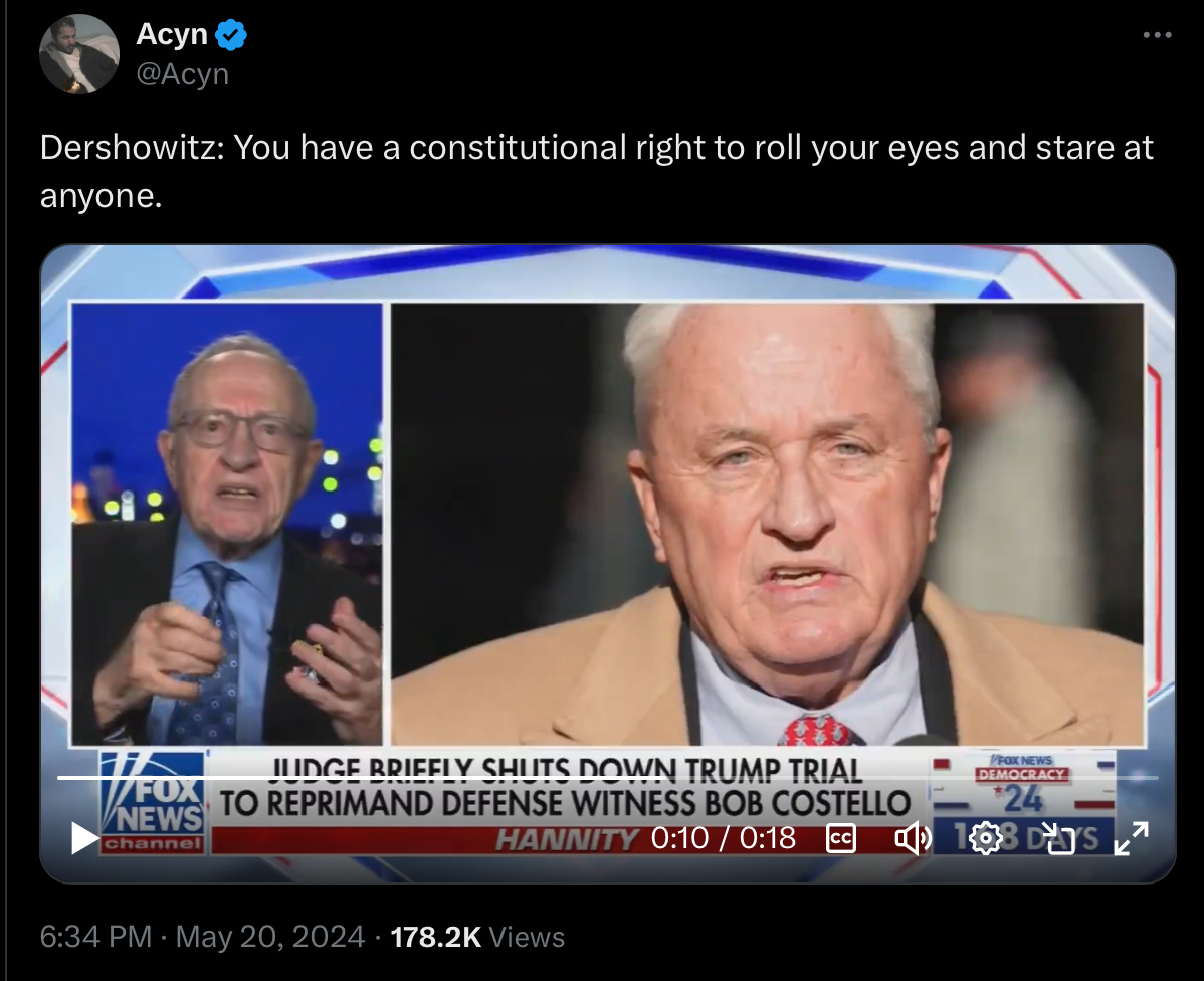 But as nearly as I can tell, a trial judge in her courtroom really is the nearest thing in our society to an absolute monarch. Merchan apparently could have told Costello yesterday that he was going anti-glamping in the Courthouse holding cells overnight. As angry as Merchan sounds in the transcript, I’m a little surprised he didn’t. That he didn’t probably relates more to not wanting to have to fight a habeas corpus appeal than anything. Costello is definitely on warning now and if he’s smart (I know, assuming a fact not in evidence at this point) he’ll be walking the balance beam of propriety for the remainder of his time on the witness stand.