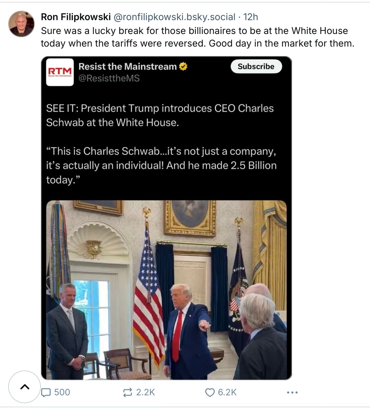 We woke up yesterday to the futures markets crashing. Then Trump posted “be cool” and then “this is a great time to buy.” Then, a few hours later, he posted that he had paused many of the tariffs on the world (but raised tariffs on China). The announcement of a “pause” pumped the market in ways that resemble a “pump and dump scheme.” In my opinion, there is market manipulation taking place. We will be fearless in our reporting of the market manipulation regardless of what Trump threatens to do to us.