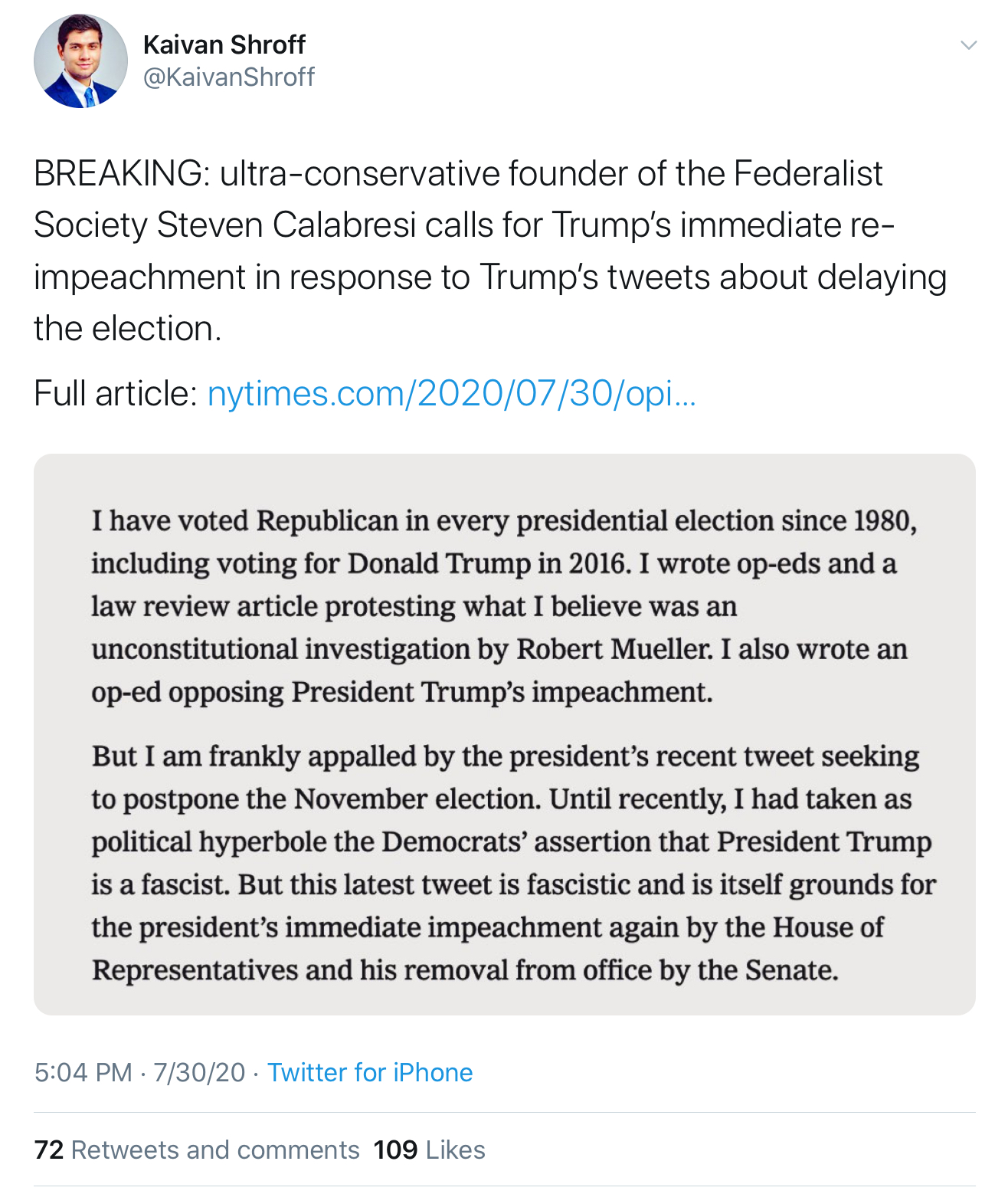 The co-founder of the Federalist Society, Steven Calabresi, is calling for trump to be re-impeached over his threat to postpone the election in November.