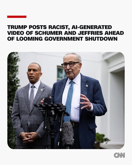 As the US government barrels toward a shutdown, President Donald Trump shared a racist AI‑generated video on social media, depicting House Minority Leader Hakeem Jeffries wearing a sombrero and a mustache and Senate Minority Leader Chuck Schumer speaking in a fake voice. https://cnn.it/4nVpbSM