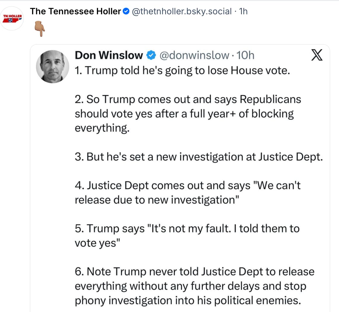 House Republicans need to vote to stop me from further blocking and obstructing the release of all the Epstein files! I demand they halt my halting of the files. Thank you for your attention, etc., etc.