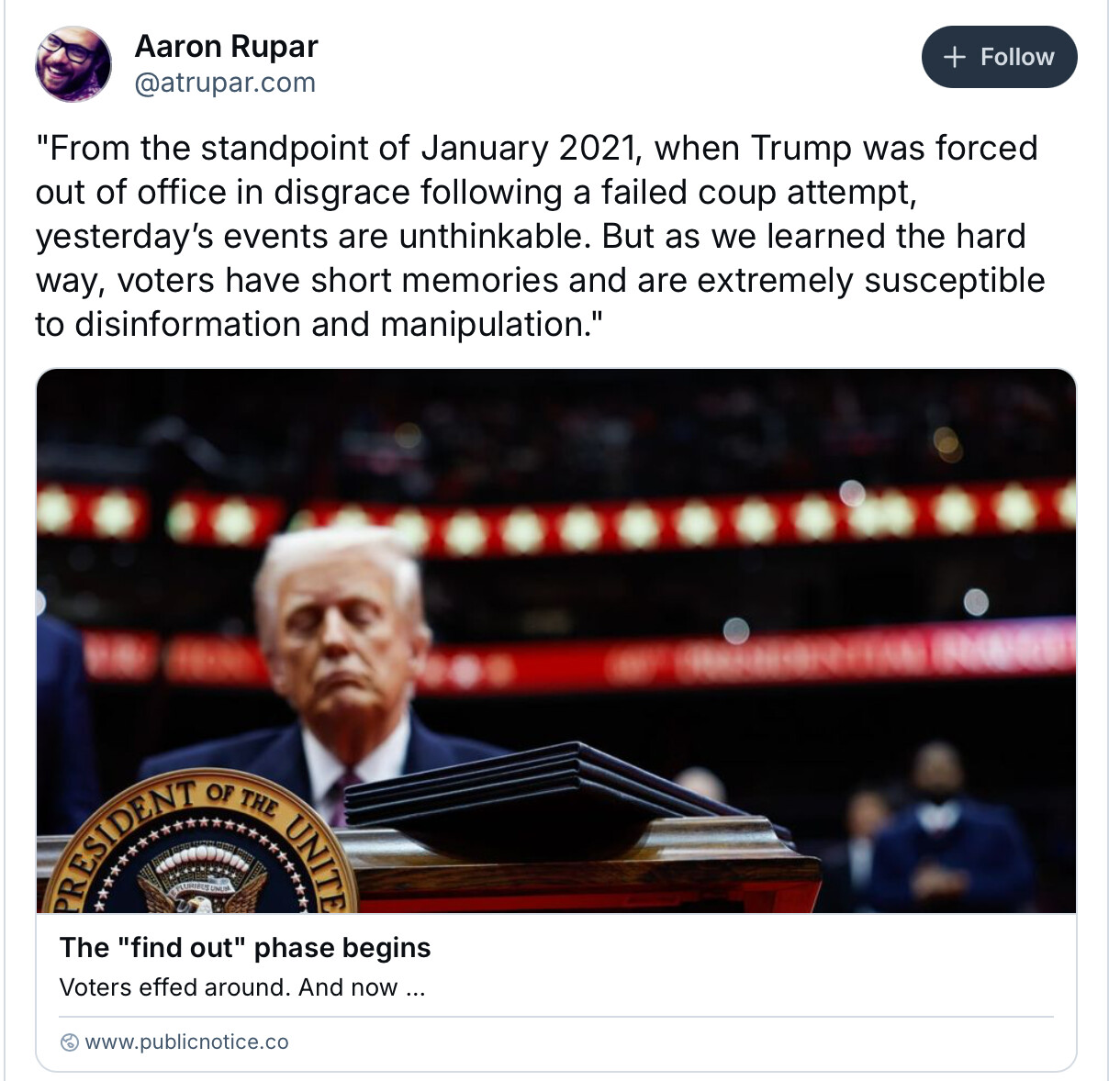 Just stating the obvious here, the “shock and awe” is also aimed at R Senators, an attempt to establish a sense of inevitability for his cabinet nominations. How dare they oppose the King in his moment of triumph!