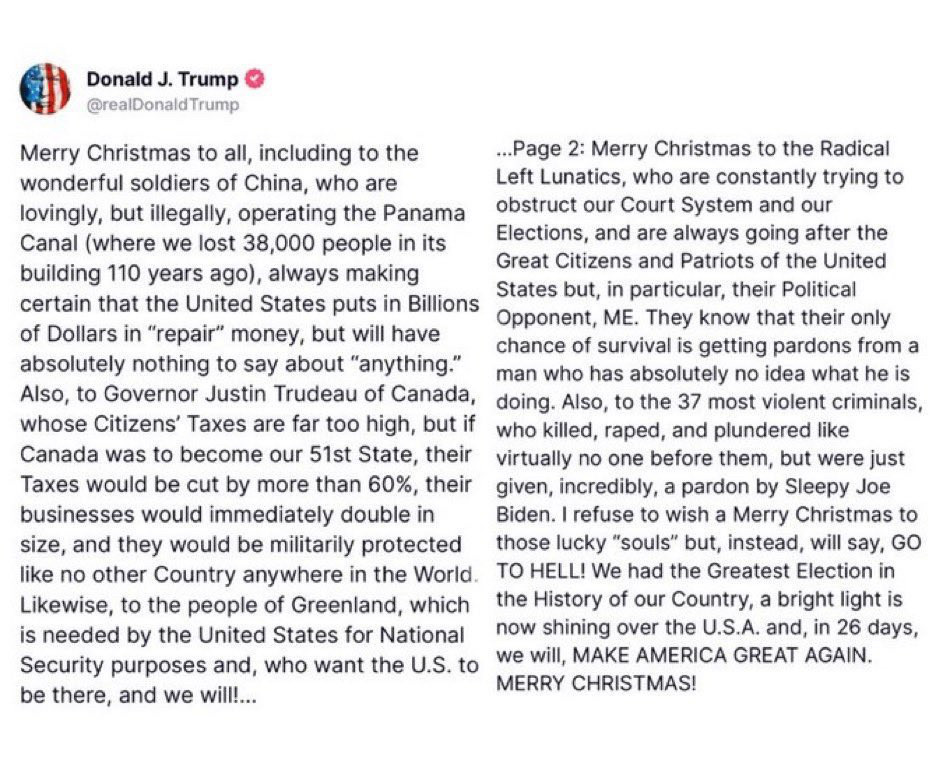 I have nothing nice to say to little donnie trump who loves to play the bully boy but really is a weakling and horribly insecure in his own manhood. He was in terrible need of therapy as a youngster but never got it. Now he’s too old for it to do any good. Very sad. Can’t even say nice things during Christmas