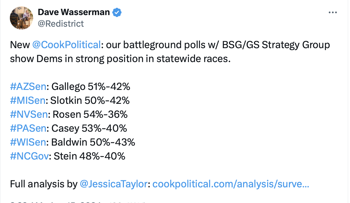 The memo neglects to mention that some of that $90 million air TV and online commitment is in Ohio. Even though it’s in the Toledo and Youngstown markets which are smaller, cheaper and reach a bit into MI and PA, this is still a big signal to Trump and the GQP that they’re going to have to compete for the state and perhaps Harris thinks it’s winnable on her momentum and Senator Brown’s and the gerrymandering referendum’s reverse coattails. September and October are going to be so riveting that fiction will suffer for our attention.